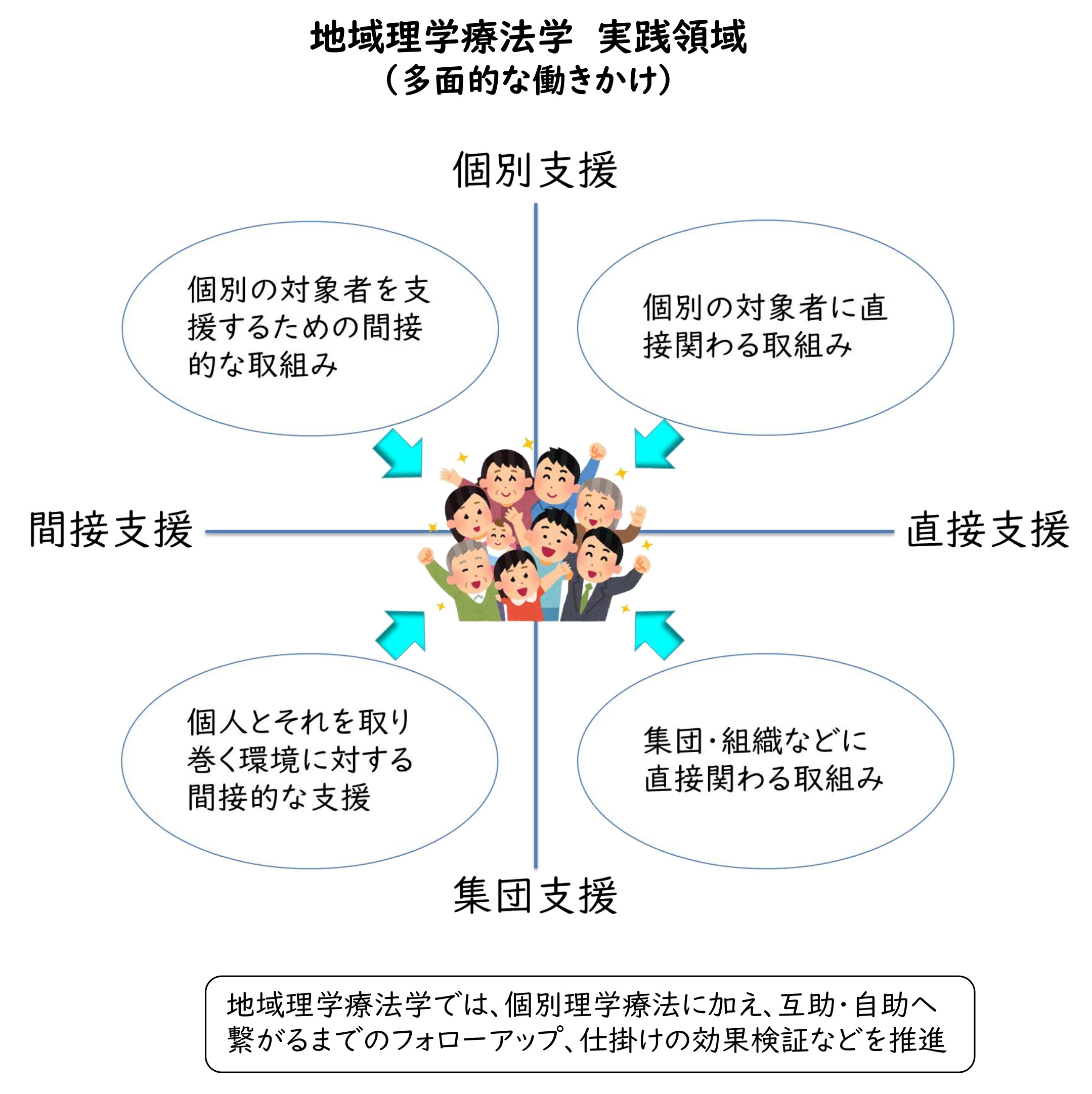 本学会では、地域理学療法学の実践領域を「個人-集団」という軸と「直接-間接」という軸を直行させた4つの領域に整理し、それを図として表しました。